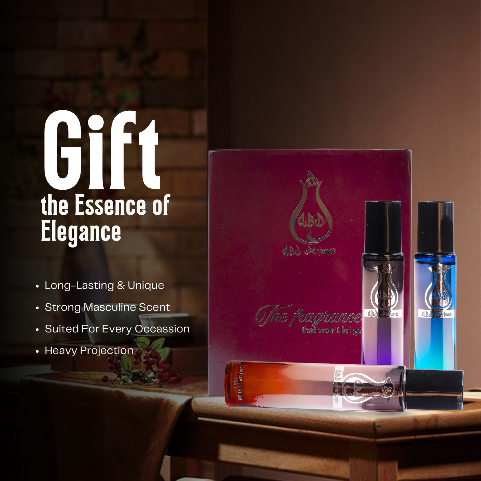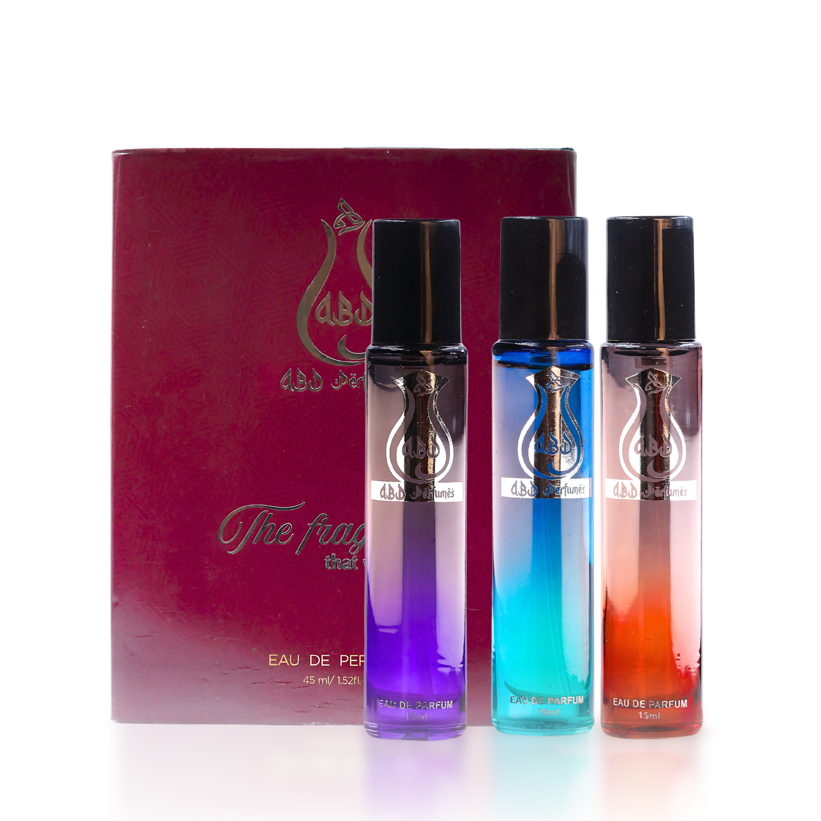 Discover elegance in every drop with the ABD Perfumes Premium Gift Set – a beautifully designed collection of three 15ml perfumes, perfect for both men and women. Crafted for those who appreciate high-quality, long-lasting fragrances, this set combines style, substance, and convenience in one elegant box. Inside the box, you’ll find three unique 15ml bottles, each featuring a distinct scent that complements different moods and occasions. Whether it’s a casual day out or a special evening event, this set ensures you always have the right fragrance at hand. These perfumes are: Suitable for daily use Compact and travel-friendly Designed to leave a lasting impression The stylish packaging makes this set ideal for gifting — whether it’s for birthdays, weddings, festivals, or simply a thoughtful gesture. The matte-finish box, magnetic closure, and neat bottle design reflect the premium quality that ABD Perfumes is known for. With long-lasting performance and a clean, modern appeal, this gift set is the perfect addition to any fragrance lover’s collection. Each bottle offers a balanced scent profile — not too strong, not too light — making them great for all-day wear. Elevate your fragrance game or surprise someone special with the ABD Perfumes Gift Set. It’s more than just a perfume box — it’s a lifestyle essential for those who love to smell good and feel confident.